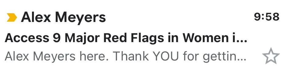 You will be getting an email with access links to 9 Major Red Flags in Women. Double check your Primary, Promotions, or Spam folder for an email with the subject line: